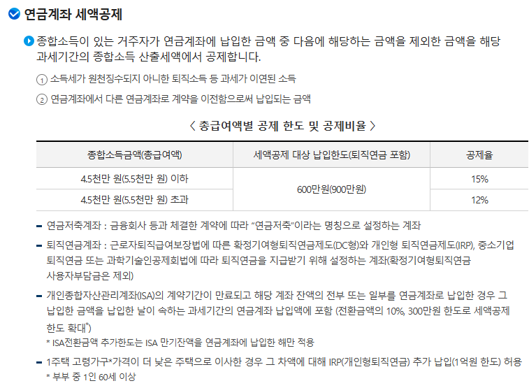 많이 헷갈리는 부분이 총 ‘납입 한도’와 세액공제를 받는 ‘공제 한도’의 구분입니다.