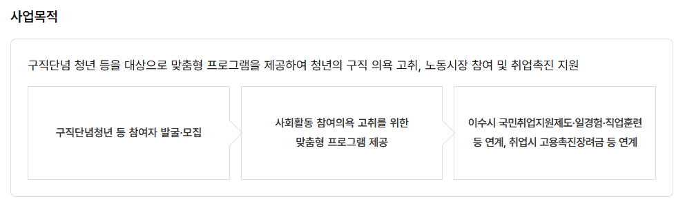 - 프로그램 참여 및 수당 지급 → 이수 후 국민취업지원제도, 직업훈련 등 추가 연계