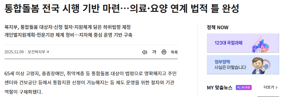 통합돌봄은 단순한 요양 서비스가 아니라 주거·의료·요양·재활을 통합해 일상의 안정성을 높이는 제도입니다. 특히 2025년부터 법적 체계가 갖춰지면서, 더 많은 사람이 서비스 혜택을 받을 수 있는 기반이 마련되었습니다.